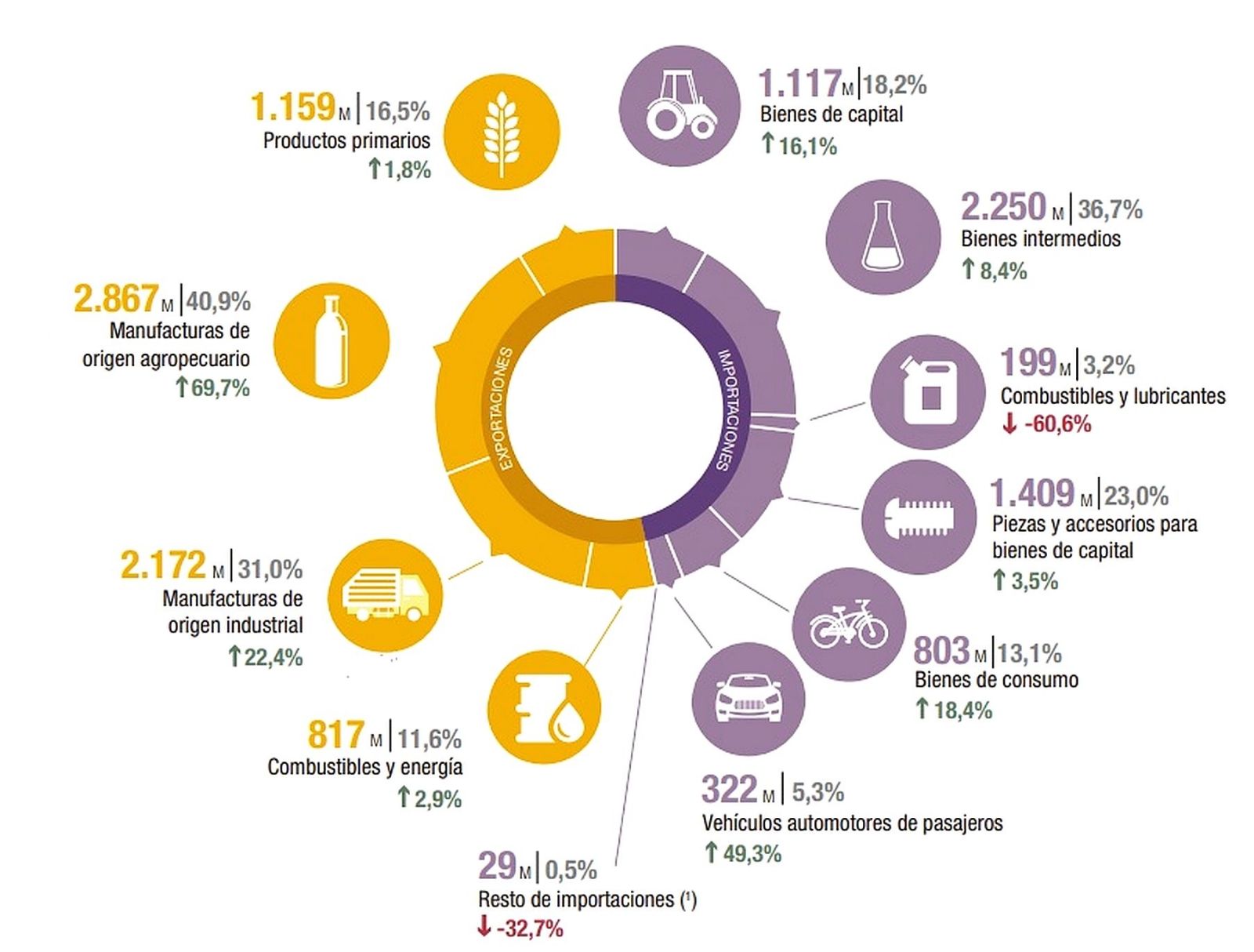 Las exportaciones totalizaron US$7.016 millones y las importaciones, US$6.128 millones. Como resultado, el intercambio comercial (exportaciones más importaciones) aumentó 17% en relación con igual mes del año anterior y alcanzó un monto de US$13.143 millones, lo que significó el registro más alto desde mayo de 2023.