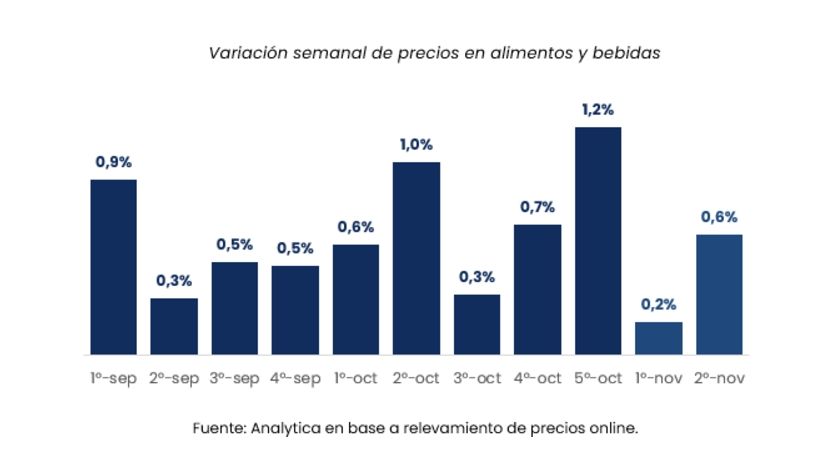 Detrás de esa misma búsqueda, la consultora LCG realizó su propio análisis de la evolución de los costos de alrededor de 8.000 alimentos y bebidas. Luego de bucear las páginas web de cinco supermercados, sus analistas llegaron a la conclusión de que estos productos alcanzaron una suba del 0,7% durante la segunda semana de noviembre.