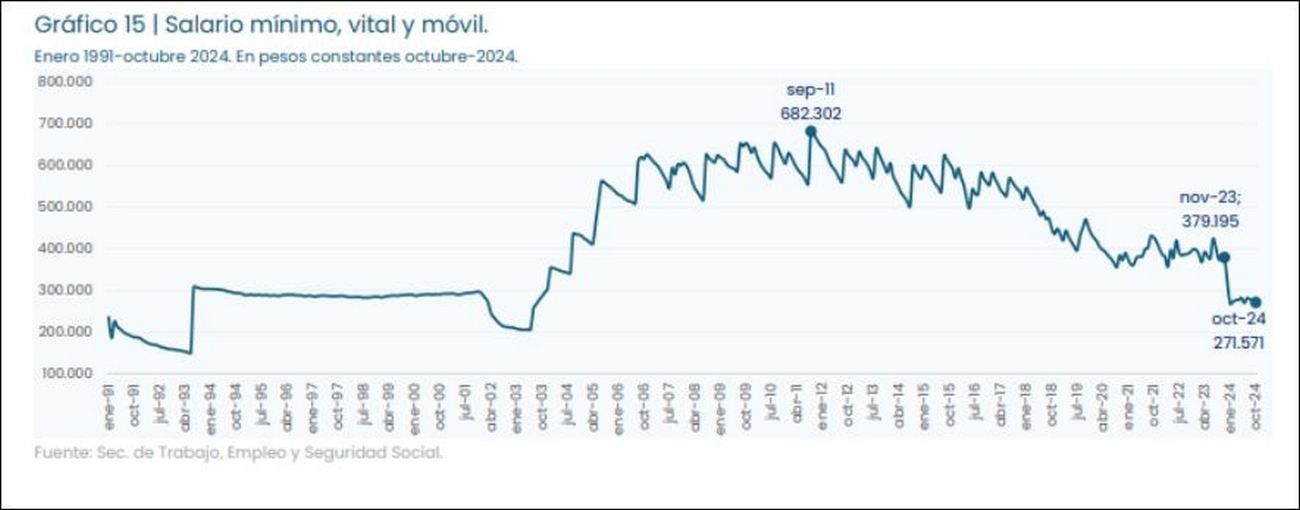 El informe que se dio a conocer este jueves, señala que desde noviembre de 2023 hasta octubre de 2024 el salario mínimo real siguió la tendencia decreciente previa, y mostró una fuerte contracción, ubicándose en un valor inferior al de 2001, antes del colapso de la convertibilidad. Asimismo, señala que el mismo sufrió una erosión de casi 60% respecto del valor máximo de la serie, que se registró en septiembre de 2011.