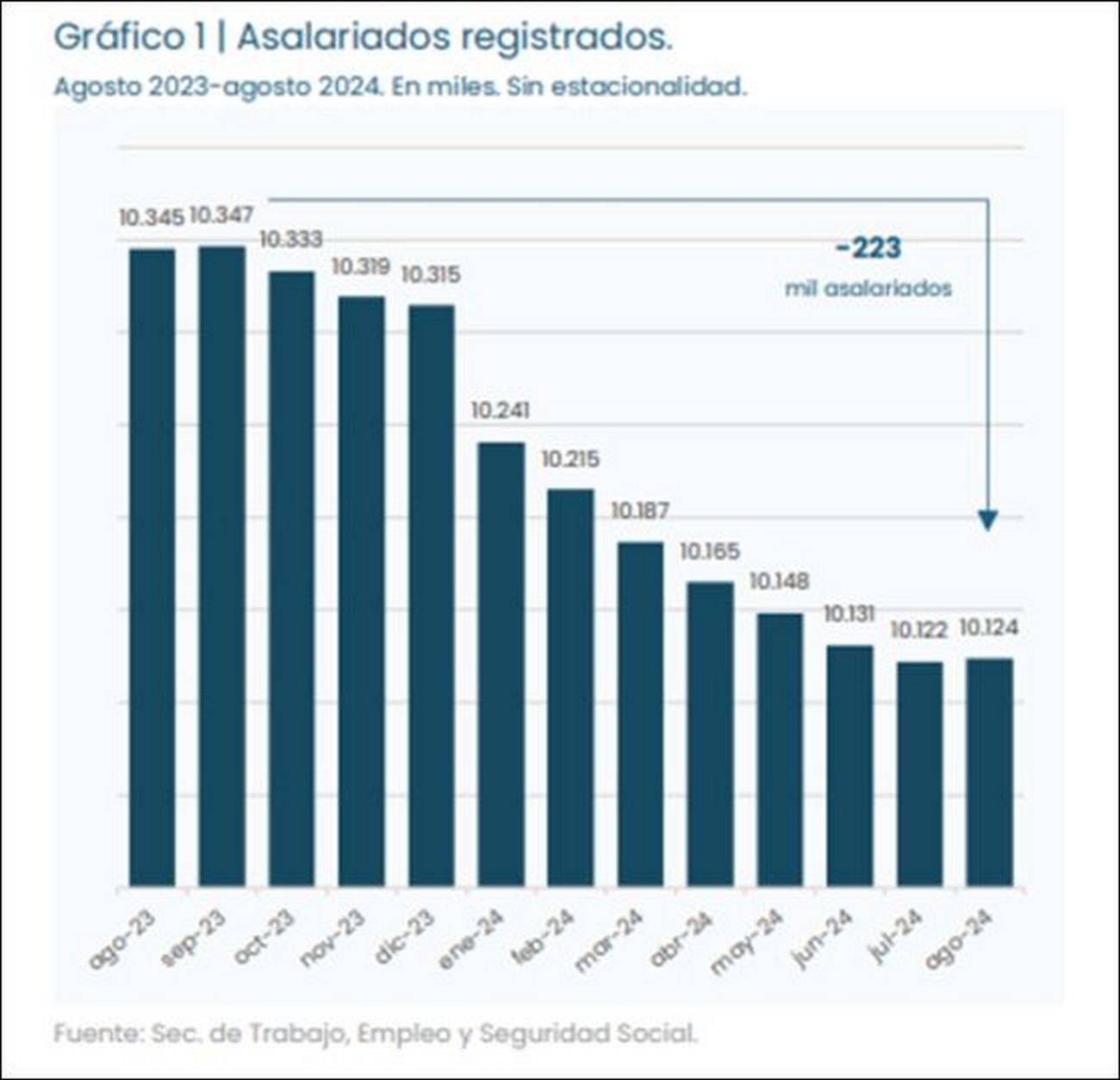 Esta evolución descendente ubica al número de asalariados formales en un valor similar al observado en noviembre de 2022 y es inferior a todos los valores mensuales de 2023.