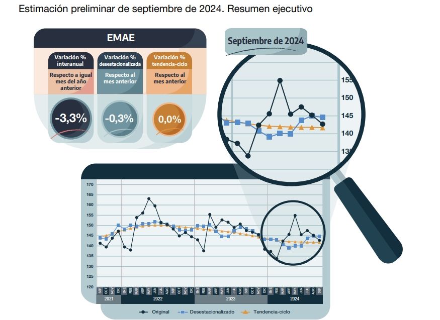 Los datos relevados durante septiembre por el índice EMAE dieron como resultado una disminución del 3,3% respecto del mismo periodo del 2023. Si la comparación se hace con el mes anterior, la caída fue de un 0,3%. En cuanto a la tendencia - ciclo, no registró variaciones.