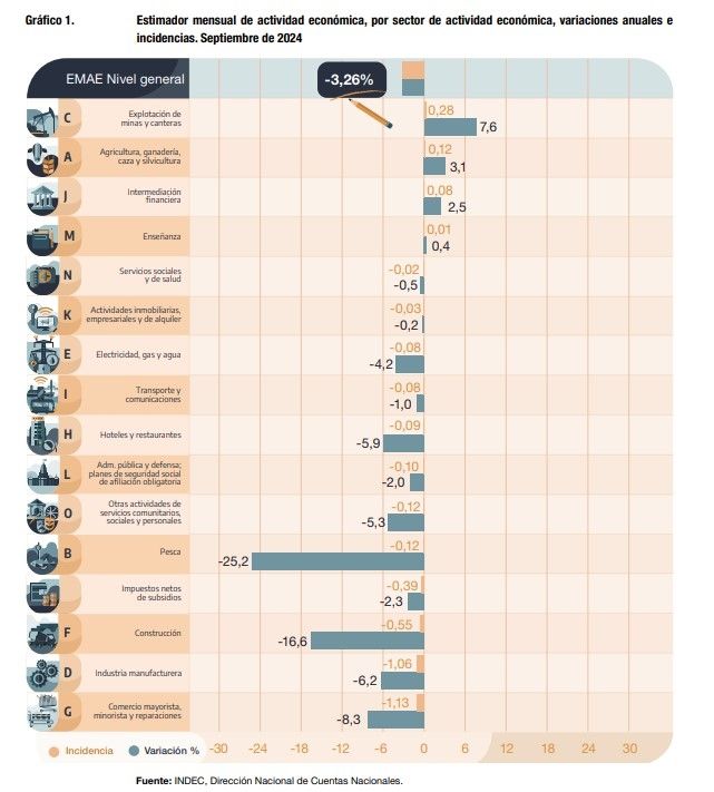 “Las actividades con mayor incidencia positiva en la variación interanual del EMAE en septiembre de 2024 fueron Explotación de minas y canteras y Agricultura, ganadería, caza y silvicultura. En contraposición, las ramas de actividad con mayor incidencia negativa fueron Comercio mayorista, minorista y reparaciones” e “Industria manufacturera,”, afirmó el INDEC.