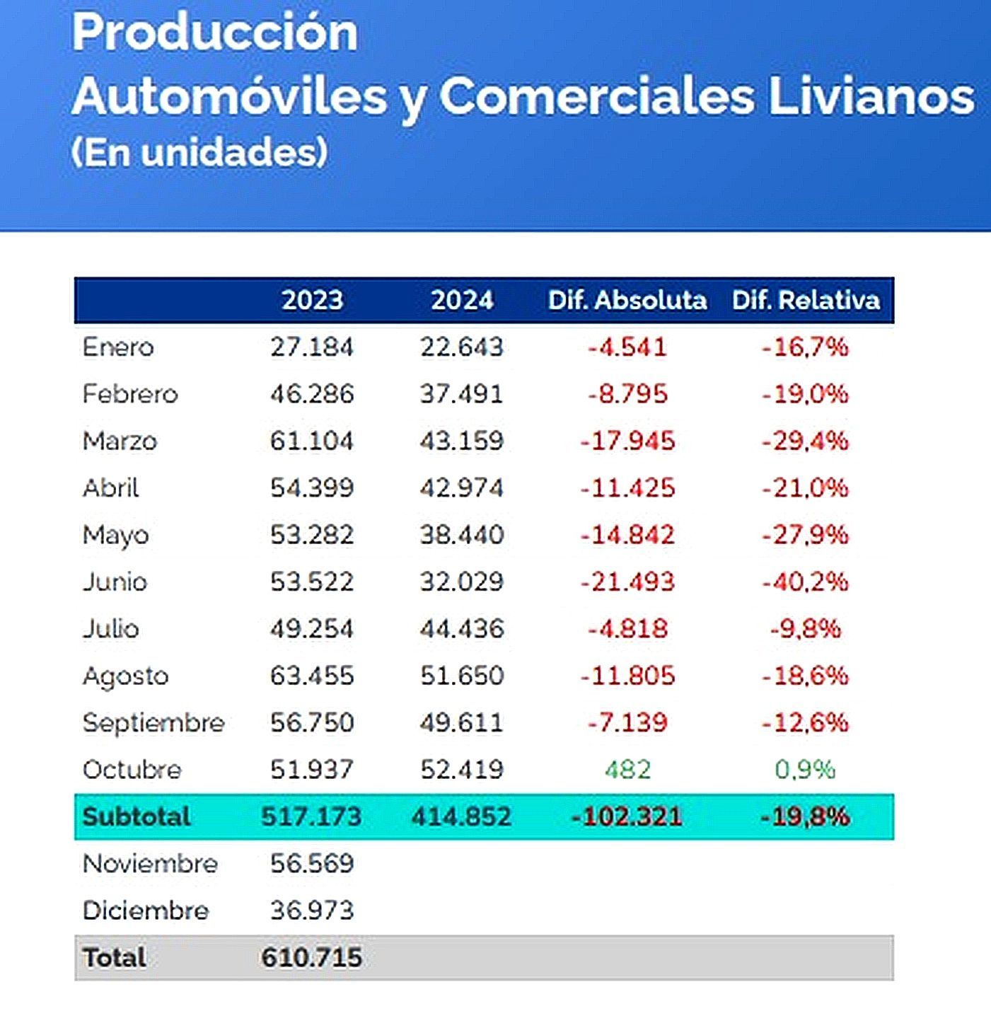 En el acumulado de los primeros diez meses del año, el sector produjo 414.852 vehículos de pasajeros y utilitarios, es decir, registró una baja de 19,8 % respecto del volumen que se fabricó entre enero y octubre de 2023.