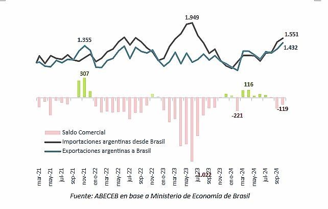 En octubre, Argentina totalizó un déficit comercial con Brasil por US$ 119 millones, una leve mejora después del negativo de 182 millones observados en septiembre.