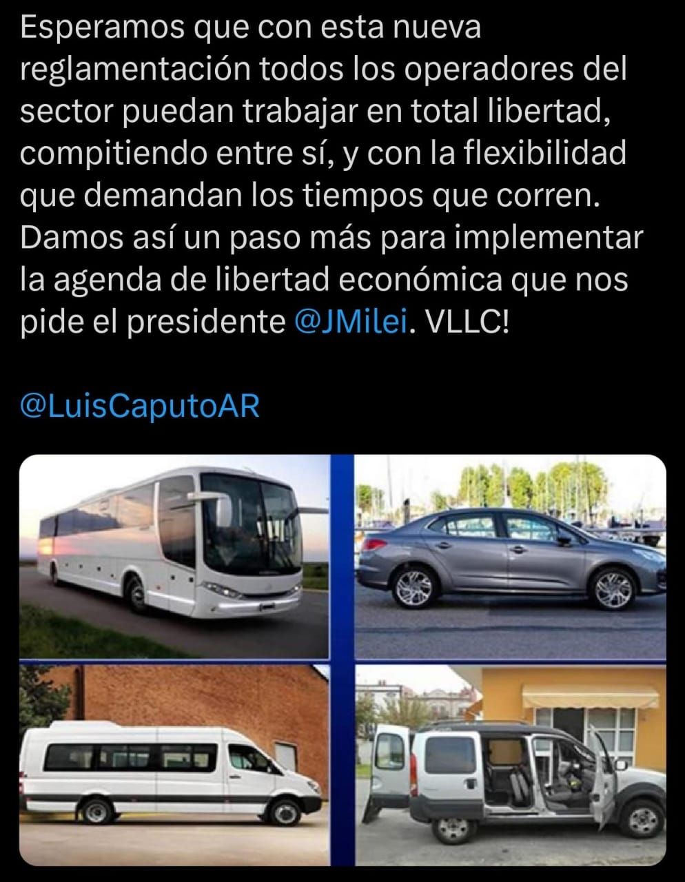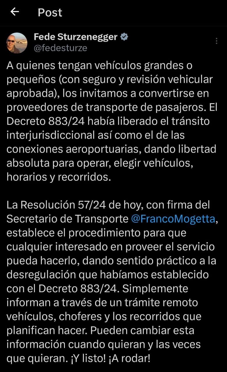 Por su parte, el ministro de Desregulación y Transformación del Estado, Federico Sturzenegger, celebró la medida en sus redes sociales. “A quienes tengan vehículos grandes o pequeños (con seguro y revisión vehicular aprobada), los invitamos a convertirse en proveedores de transporte de pasajeros”, publicó el funcionario llamando a los interesados a inscribirse dentro de la nómina.