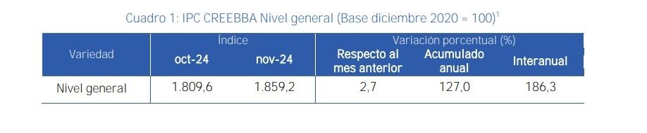 Finalmente, un adelanto válido del incremento de precios es el calculado por el Centro Regional de Estudios Económicos de Bahía Blanca (CREEBBA). “En noviembre el Índice de Precios al Consumidor (IPC-CREEBBA) mostró una variación del 2,7% (0,3 puntos porcentuales por encima del guarismo de octubre). Con este dato, la inflación acumulada durante 2024 alcanzó el 127,0% en tanto que la variación interanual ascendió a 186,3%”, sostiene el informe.