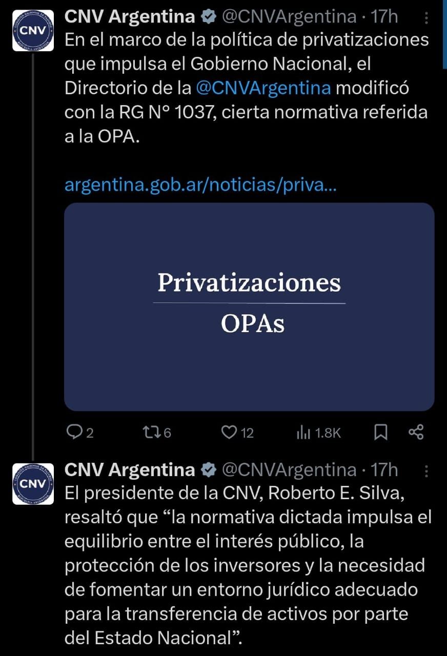 La CNV modificó la normativa referente a las Ofertas Públicas de Adquisición (OPA) con el objetivo de facilitar la privatización de empresas públicas, “siempre que el adquirente privado asuma la misma posición del vendedor en un convenio de accionistas preexistente, sin alterar la participación en la sociedad controlante directa o indirecta”.