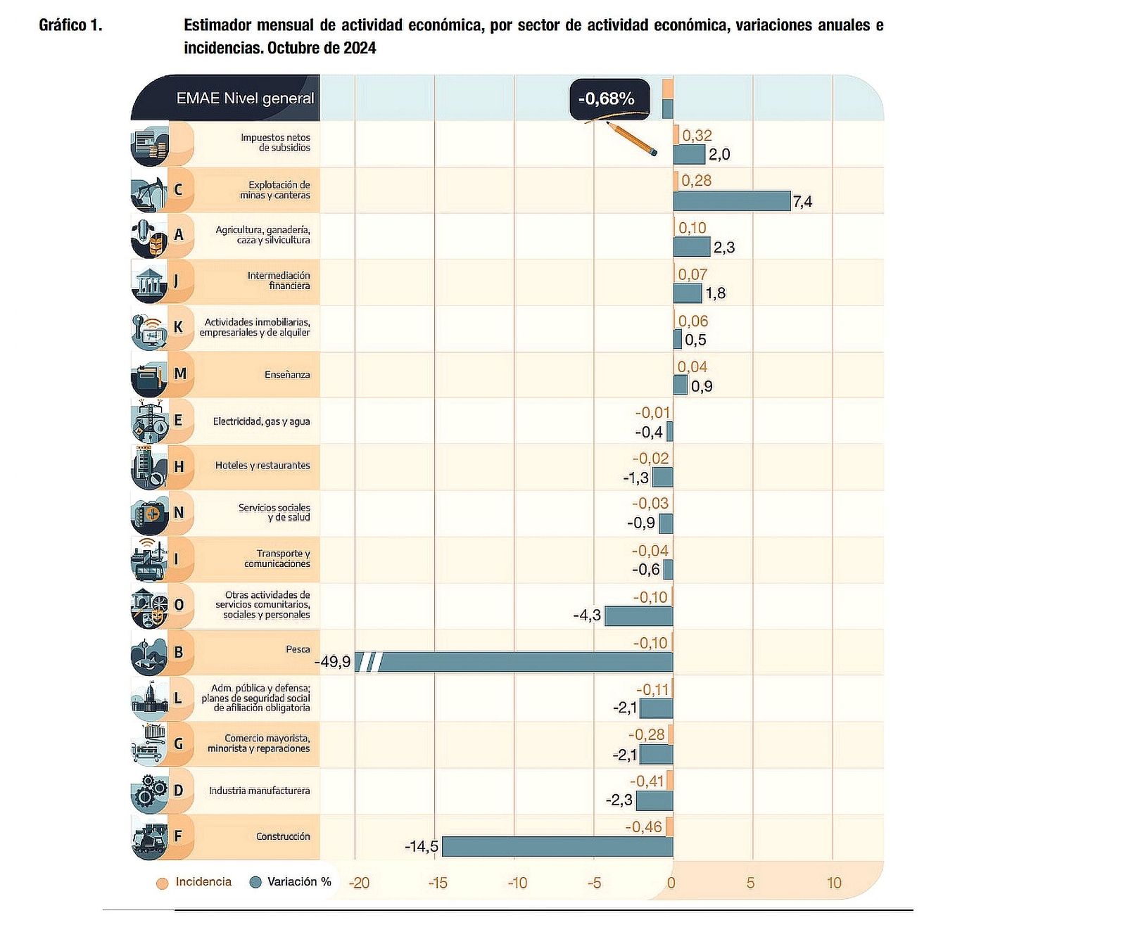 La actividad económica, medida por el Indec en el EMAE (Estimador Mensual de la Actividad Económica), cayó un 0,7% interanual durante el octubre e hilvanó cinco meses seguidos de descenso, tras la mejora del 1,4% en mayo, aunque lejos del derrumbe del 8,4% de marzo.