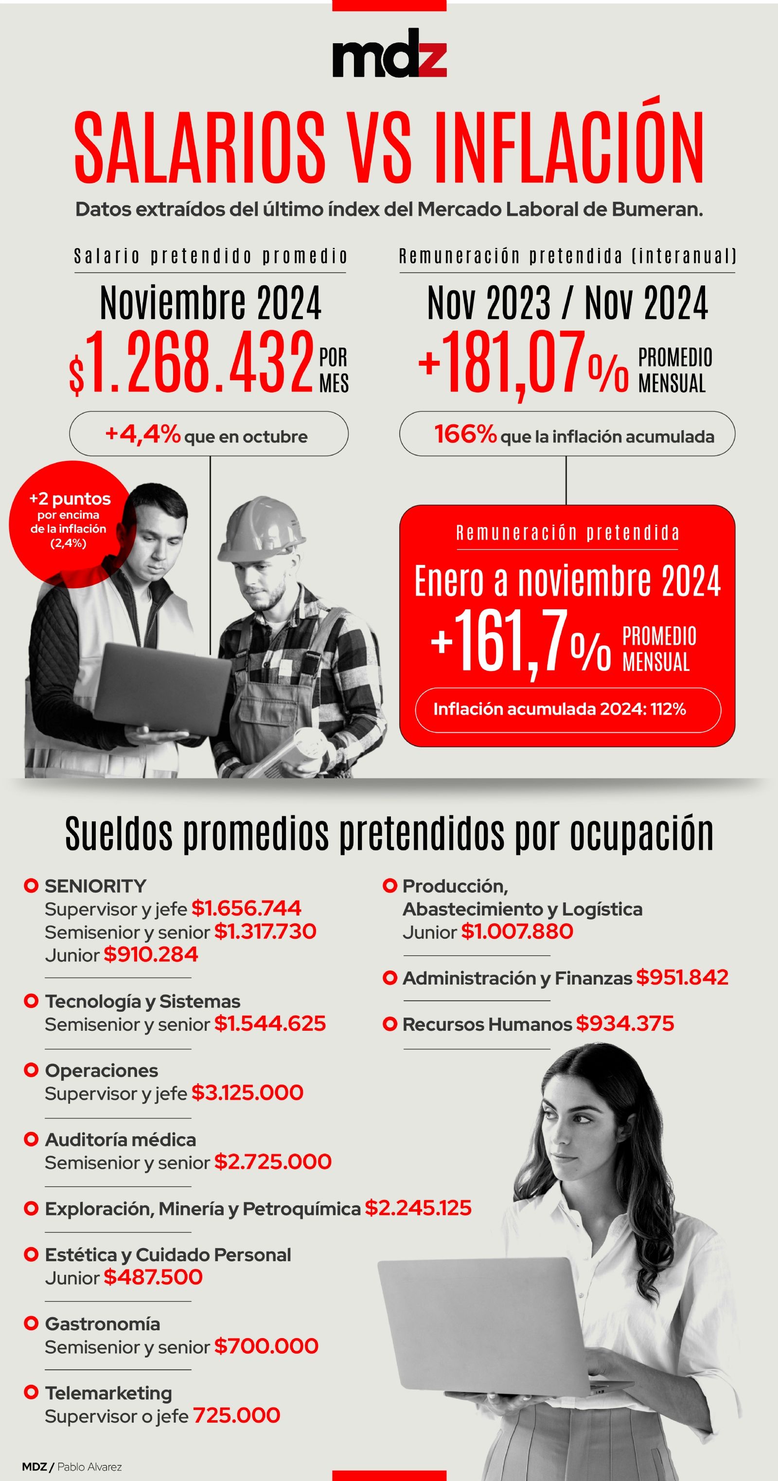 En lo que va del año, los salarios pretendidos subieron un 161.7%, y se ubican por sobre la inflación acumulada en 2024, que llegó al 112,0%.