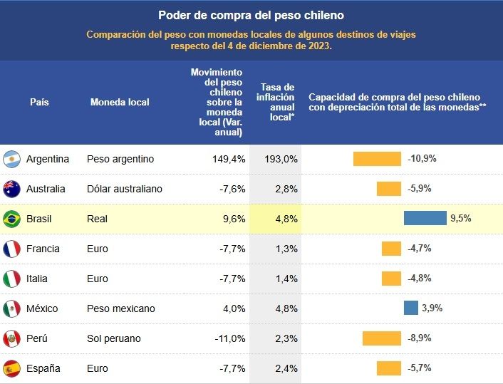 Con Brasil, por otra parte, el peso chileno está mejor avaluado y, al combinarlo con los niveles inflacionarios de aquel país, permitirían un aumento del poder de compra de casi 10%. Por eso, Brasil aparece como una alternativa que puede arrastrar mucho turismo, como también lo está haciendo con muchos argentinos.
