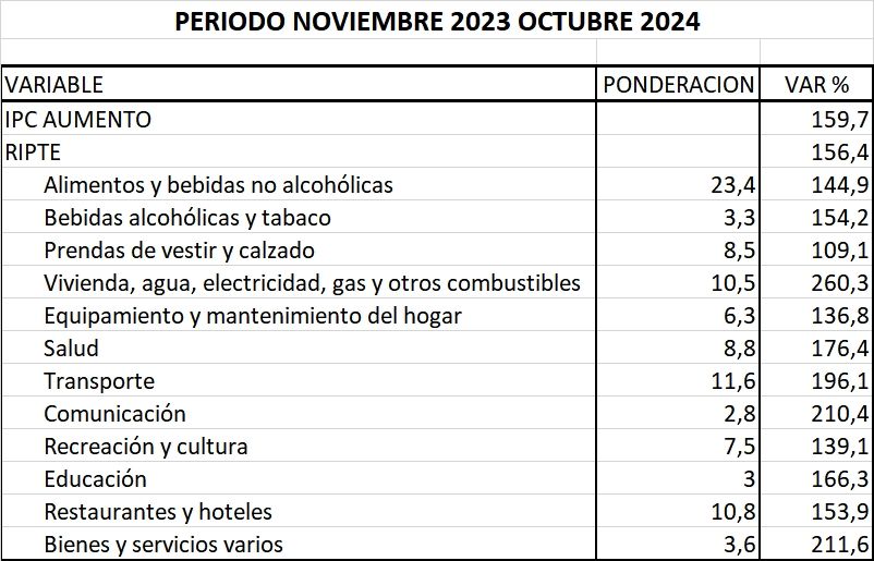 El cuadro muestra la evolución del IPC, el RIPTE (Remuneración Imponible Promedio de los Trabajadores Estables) y los rubros desagregados del IPC. En ese cuadro se encuentran con los siguientes datos.
