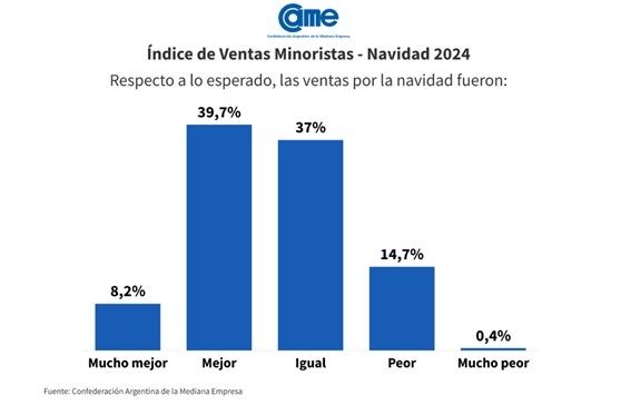 Si bien el balance de las ventas navideñas en comercios minoristas subió un 1% respecto del año pasado, la Confederación Argentina de la Mediana Empresa (CAME) afirmó que el resultado no fue el esperado, sobre todo si se tiene en cuenta que la festividad en 2023 fue “austera” y cargada de incertidumbre por parte de los consumidores. La asociación hizo un relevamiento durante el 23 y el 24 diciembre sobre 240 comercios.
