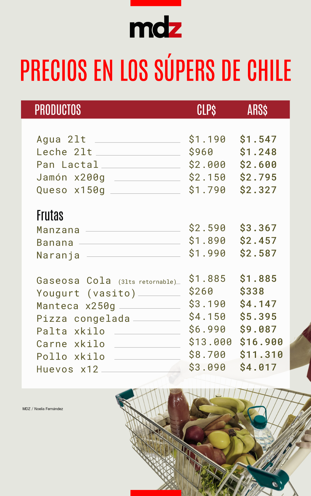- Frutas (por kilo): Manzana: CLP$2.590 ($3.367); Banana: CLP$1.890 ($2.457); Naranja: CLP$1.990 ($2.587)