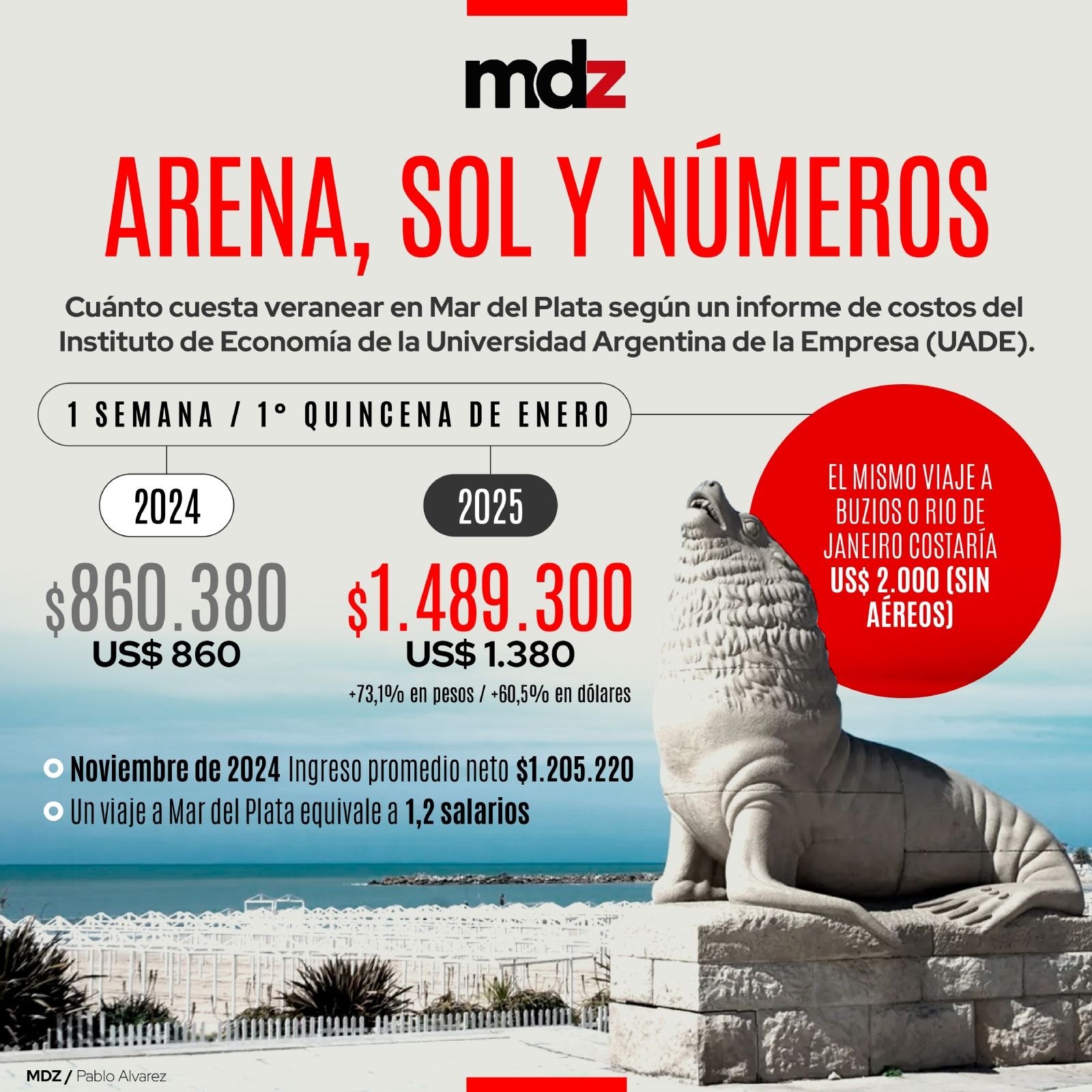 Los economistas de la UADE también presentaron una comparación entre las estimaciones actuales y los valores que habían calculado para el verano de 2024 para hacer el viaje de descanso. “El año pasado costaban $860.380 o US$ 860. Es decir que, medido en pesos, hubo un aumento de 73,1%, y en dólares, de 60,5%", indicaron desde UADE.