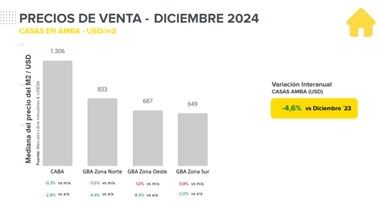 Según el informe del sector para este último mes de 2024 que realizó MercadoLibre, en colaboración con la Universidad de San Andrés, las caídas en el precio fijado en los términos de la moneda norteamericana para la adquisición de este tipo de inmuebles fue del 2,8% en la Ciudad Autónoma de Buenos Aires, del 4,4% en la zona norte del Gran Buenos Aires, del 2% en el sur de esta parte de la provincia y del 8,4% en la región oeste.