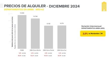 En cuanto a los precios requeridos por los propietarios para el arrendamiento de departamentos en términos mensuales, el trabajo publicado por MercadoLibre evidenció un crecimiento del 2% en diciembre de 2024 respecto a las cotizaciones publicadas en noviembre.