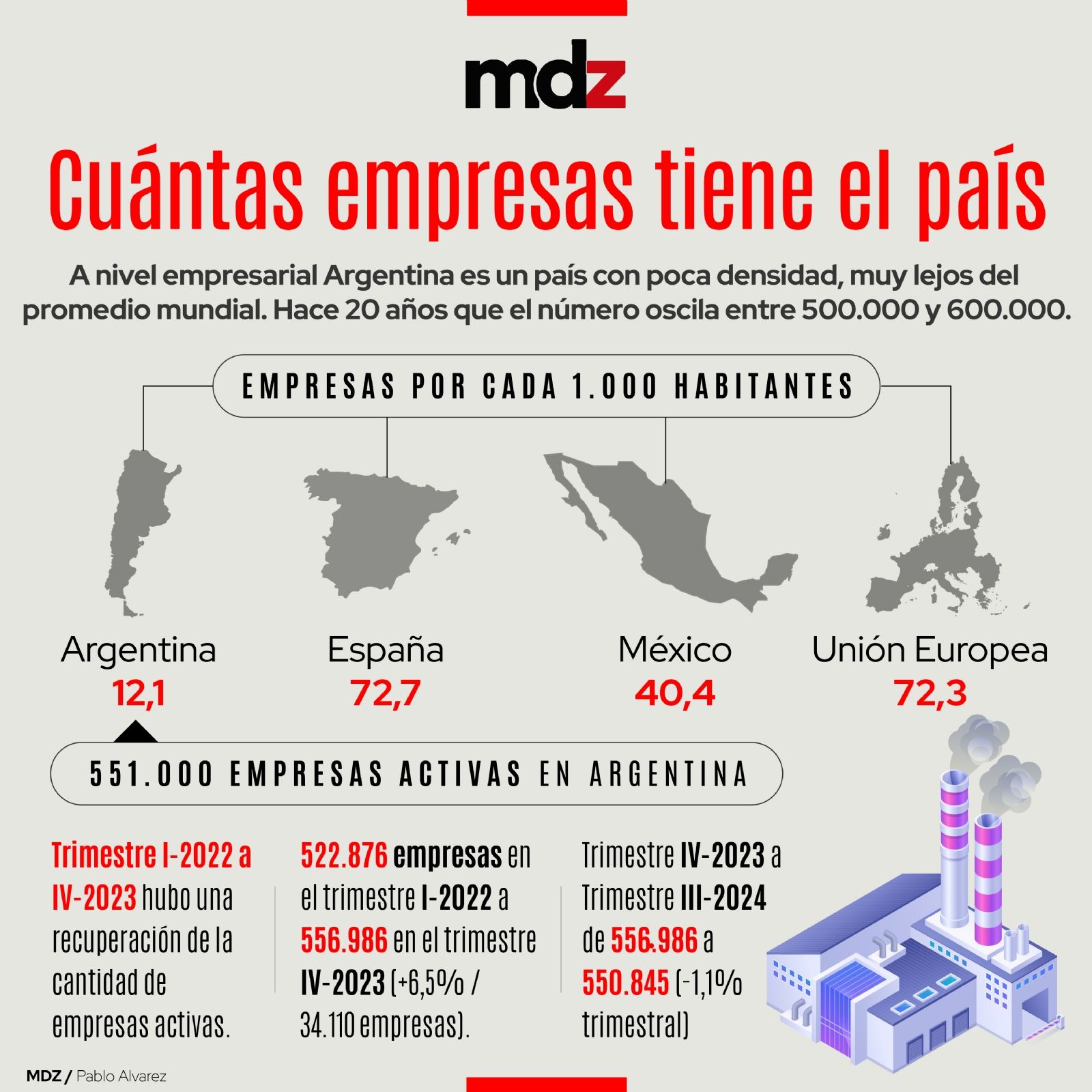 Un monitoreo de la Fundación Observatorio Pyme (FOP) arrojó que el nivel de densidad empresarial en Argentina es bajo dado que el país cuenta con 551.000 empresas activas, o sea, 12,1 empresas por cada 1.000 habitantes, muy lejos de los que, por ejemplo, hay en la Unión Europa (72,3), España (72,7) o México (40,4).