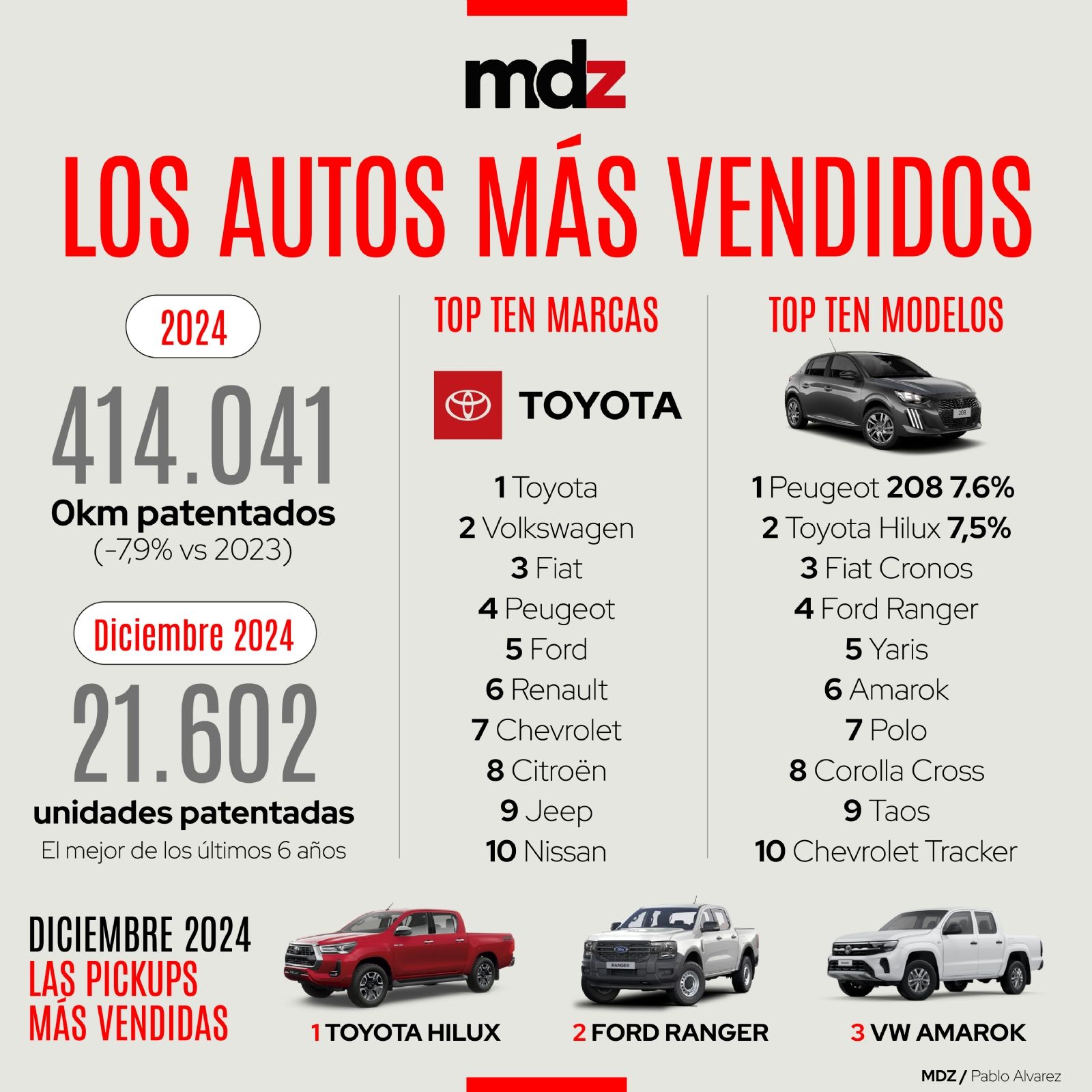 El ranking de los modelos más vendidos del año fue encabezado por el Peugeot 208, con 7.6% de participación. Le sigue la Toyota Hilux, con 7,5%. El tercer lugar fue para el Fiat Cronos.