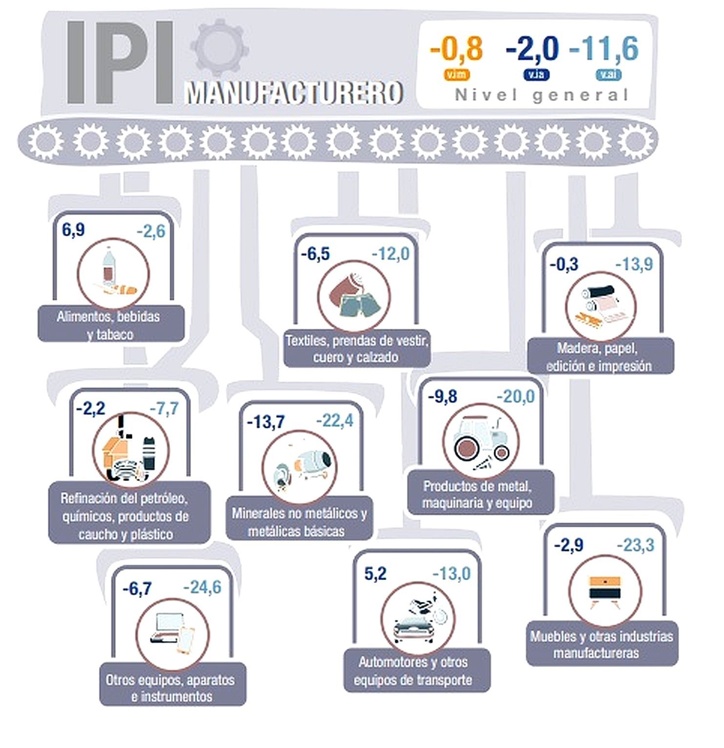 En total. once de las dieciséis divisiones de la industria manufacturera presentaron caídas interanuales. Las más afectadas fueron Productos minerales no metálicos con bajas del 16,8%, Industrias metálicas básicas con caída del 11,4%. Productos de caucho y plástico con bajas del 12%, Productos de metal con disminución del 12,3%, Maquinaria y equipo del 8% y Productos textiles del 20,9%.