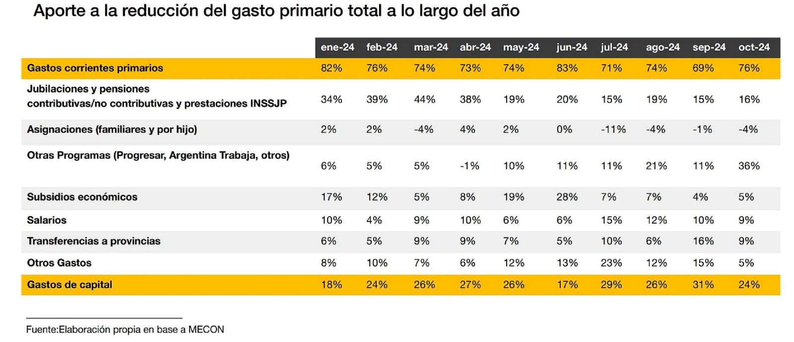 El rubro que más aportó al ajuste del gasto fue jubilaciones y pensiones (contributivas y no contributivas) y prestaciones de INSSJP con el 26%, seguido por gastos de capital con el 24%. El único rubro que mostró alza en términos reales fue asignaciones familiares y asignaciones por hijo, creciendo 8% interanual.