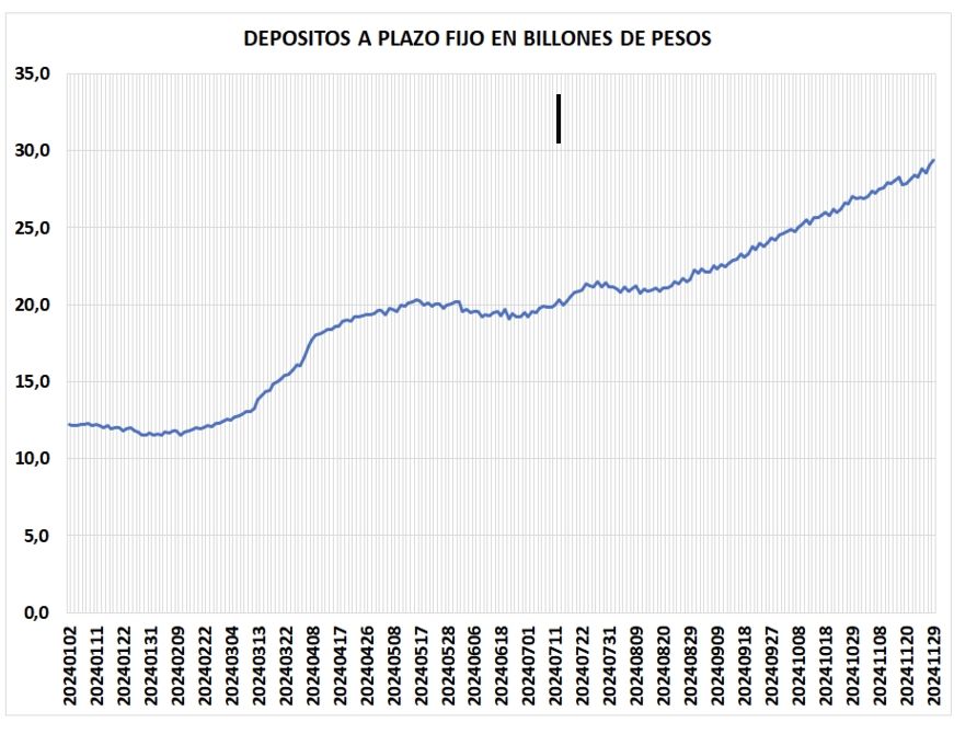 El gráfico muestra claramente que a fines de julio el stock de depósitos a plazo fijo del sector privado empieza a crecer aceleradamente. En efecto, entre el 22 de julio y el 29 de noviembre, el stock de depósitos a plazo fijo aumentaron el 40% cuando la inflación en ese período fue del 14%. Es decir, crecieron el 23% en términos reales los depósitos a plazo fijo.