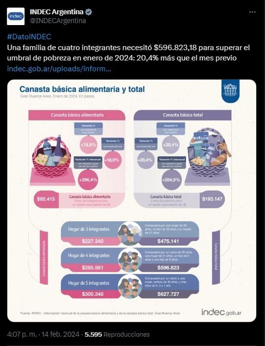 El Instituto Nacional de Estadística y Censos (Indec) informó hoy que la canasta básica subió 20,4% en enero pasado y una familia tipo necesitó $596.823,18 para no ser pobre. En tanto, se precisaron $285.561 para no caer en la indigencia.