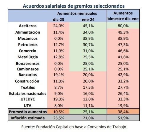 El punto central es que el mes pasado, en un contexto sin precios de referencia por falta de una pauta de ingresos oficial y la reinante incertidumbre, "los acuerdos entre sindicatos y cámaras empresariales se volvieron aún más cortos que en 2023, negociándose bimestralmente o incluso mes a mes", destaca el informe. Los gremios con mayor peso y poder de negociación impulsaron acuerdos por 30 días, pero con un salto en el ajuste de enero.