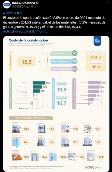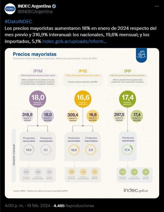 De esta manera, el Indec, terminó con la difusión de los índices de precios que inició la semana pasada con la variación de los valores minoristas, que subieron 20,6% en enero y acumularon un alza el 254,2% en los últimos 12 meses.