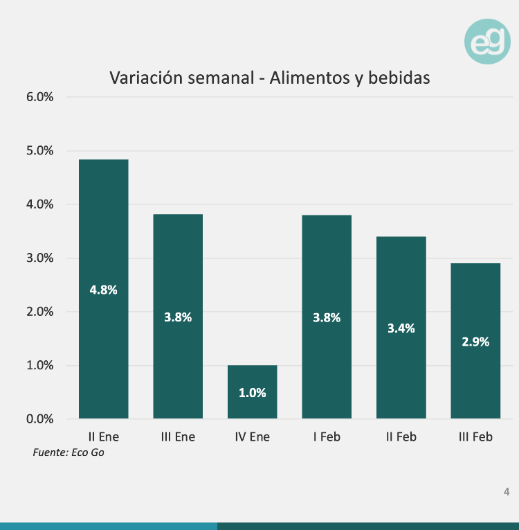 En tanto, en lo que respecta a inflación de alimentos, el informe de EcoGo calculó que durante la tercera semana de febrero, los alimentos consumidos dentro del hogar experimentaron un aumento del 2,9%, marcando una desaceleración de 0,5 puntos porcentuales respecto a la semana anterior. Con este dato, y proyectando aumentos del 3% para las semanas restantes, la inflación de alimentos consumidos dentro del hogar alcanzaría el 14,7% en febrero. Si además se incorporan los incrementos registrados en alimentos consumidos fuera del hogar, la inflación en alimentos se ubicaría en 14,6%.