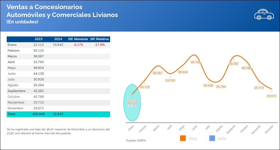 Adefa, la cámara que engloba a las terminales automotrices, informó que en enero la producción de vehículos alcanzó las 22.643 unidades, un 38,8% menos que diciembre y un 16,7% por debajo del volumen de enero de 2023.