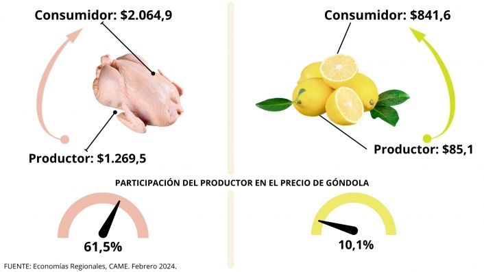 En promedio, la participación del productor explicó el 28% de los precios de venta final. La mayor participación la tuvieron los productores de pollo (61,5%), mientras que la menor fue para los de limón (10,1%).