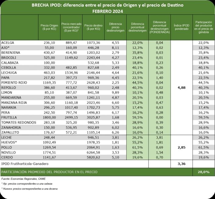 Según el Índice de Precios en Origen y Destino (IPOD) elaborado por el sector de Economías Regionales de la Confederación Argentina de la Mediana Empresa (CAME), en febrero los precios de los agroalimentos se multiplicaron por 3,4 veces del campo (origen) a la góndola (destino). Es decir, el consumidor pagó $3,4 por cada $1 que recibió el productor.