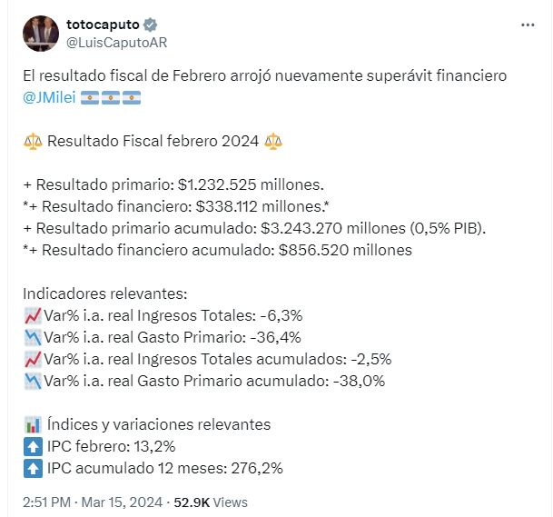 El Gobierno nacional volvió a lograr superávit fiscal en febrero, de casi 340 mil millones de pesos. Así lo informó el ministro de Economía, Luis Caputo, en sus redes sociales.
