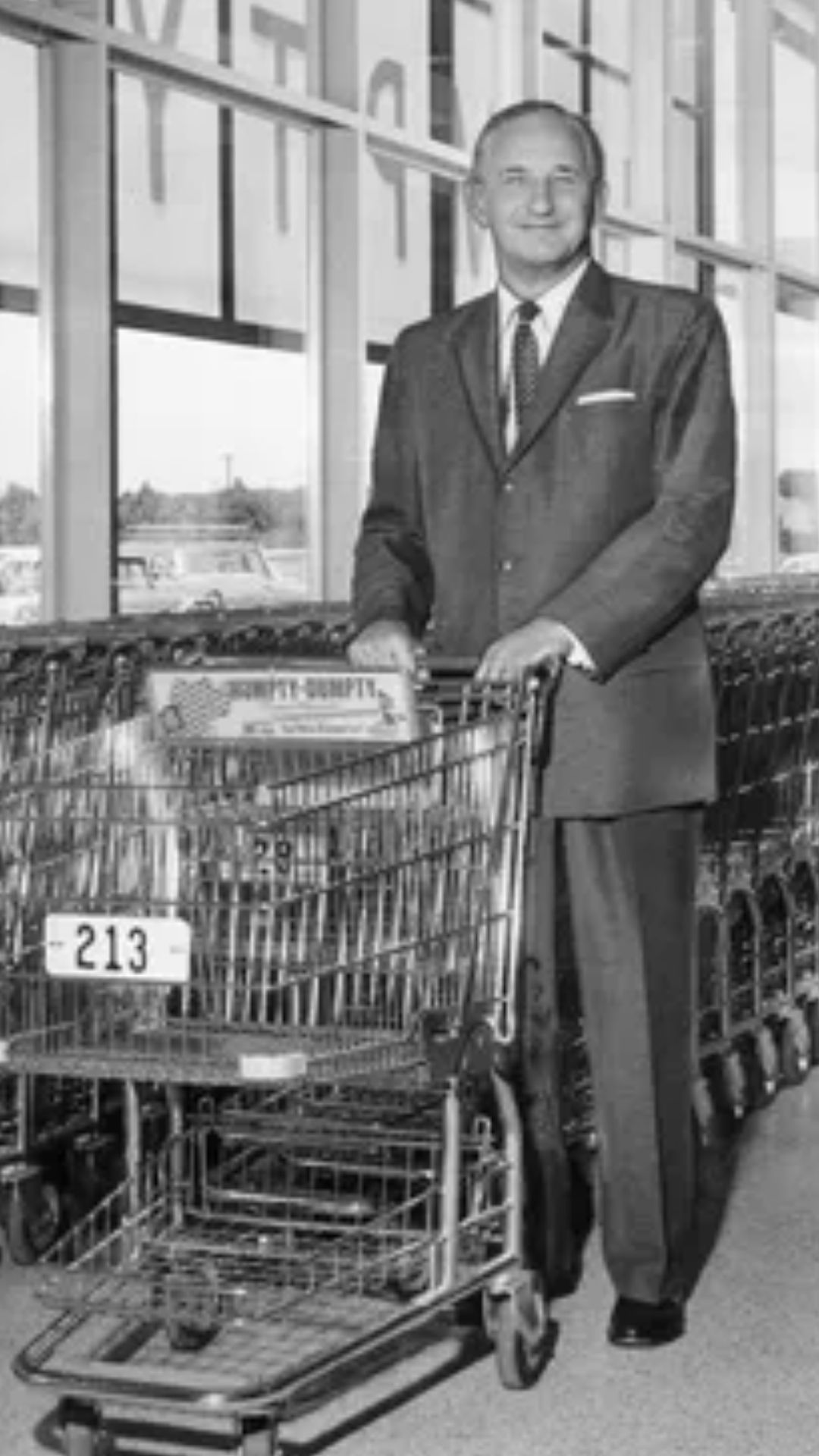 Preocupado por encontrar una solución y luego de probar diferentes alternativas ideó un carro de metal con ruedas, similar a un cochecito de bebé, con dos niveles de cestas que los clientes podían empujar y llenar con productos de manera confortable.