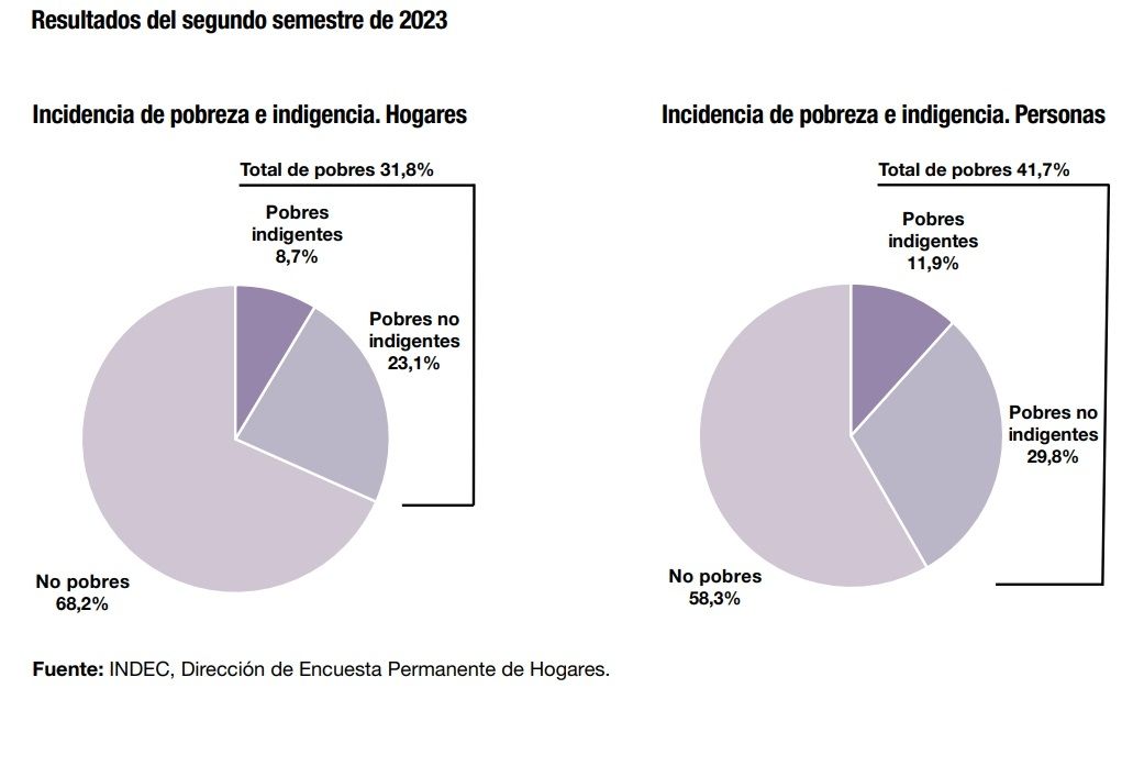La índice de pobreza en Argentina concluyó en 2023 en un 41,7%, de esta forma dio un nuevo salto tras el 40,1% del primer semestre de 2023, lo que implica una suba de 2,5 puntos porcentuales respecto del mismo período de 2022 cuando llegó a 39,2%. Aunque aún está lejos del récord del 57,5% del primer semestre del 2002.