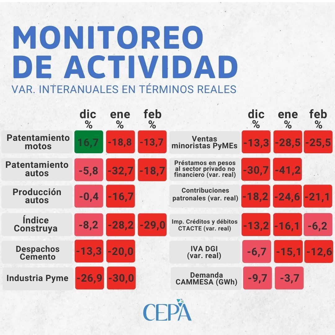 Los últimos datos cuentan que en el mes de enero o febrero, (según la última medición disponible) cayó la producción de autos (-16,7%) como el patentamiento (-18,7%); el patentamiento de motos (-13,7%); las ventas de insumos para la construcción medidos tanto por el índice Construya (-29%), como los despachos de cemento medidos por la Cámara de cemento portland (-20%). Además se desplomaron las ventas minoristas (-25,5%) y la producción de empresas pymes (-30%).