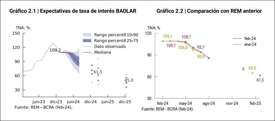 La tasa de interés BADLAR se define como la tasa promedio ponderado por monto, correspondiente a depósitos a plazo fijo de 30 a 35 días de plazo de más de un millón de pesos. La tasa relevada por el REM es la tasa BADLAR promedio mensual (días hábiles), en pesos, en bancos privados. Se relevan estimaciones de 6 períodos mensuales, la evolución para los próximos 12 meses y 2 períodos anuales.