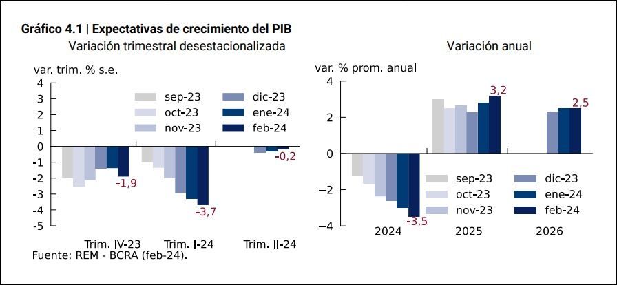Además, se pronostica el tipo de cambio nominal en $860 por dólar para el promedio de marzo de 2024 y en cuanto al comercio exterior de bienes, consideran que las exportaciones (FOB) totalizarán US$ 81.613 millones y las importaciones (CIF) US$ 66.822 millones.