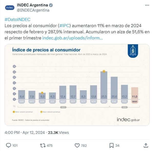 El ministro concluyó en su mensaje por la red social X que "la fuerte desaceleración en la inflación es consecuencia del programa económico implementado desde el 11 de diciembre, cuyos pilares son el equilibrio fiscal y la recomposición del balance del BCRA. La combinación de ancla fiscal, monetaria y cambiaria, y las medidas que se vienen implementando para desburocratizar el comercio interior y normalizar el comercio exterior, son fundamentales para sostener este sendero de desinflación".