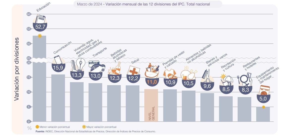 Fueron todos los rubros asociados a los servicios, los que sufrieron mayores subas. Sobresale claramente Educación que se disparó un 52,7% producto del inicio de clase. Le siguen Comunicación (15,9%), por las subas en servicios de telefonía e internet, y Vivienda, agua, electricidad, gas y otros combustibles (13,3%), por alzas en el servicio de electricidad. El rubro Alimentos y bebidas no alcohólicas registró una suba del 10,5%, en línea con la inflación general.