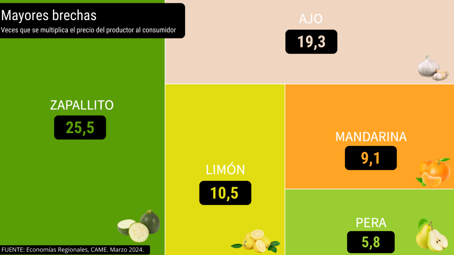 El zapallito (25,5 veces), el ajo (19,3), el limón (10,5), la mandarina (9,1) y la pera (5,8), fueron los cinco productos que presentaron mayor diferencia entre los precios de origen y destino.