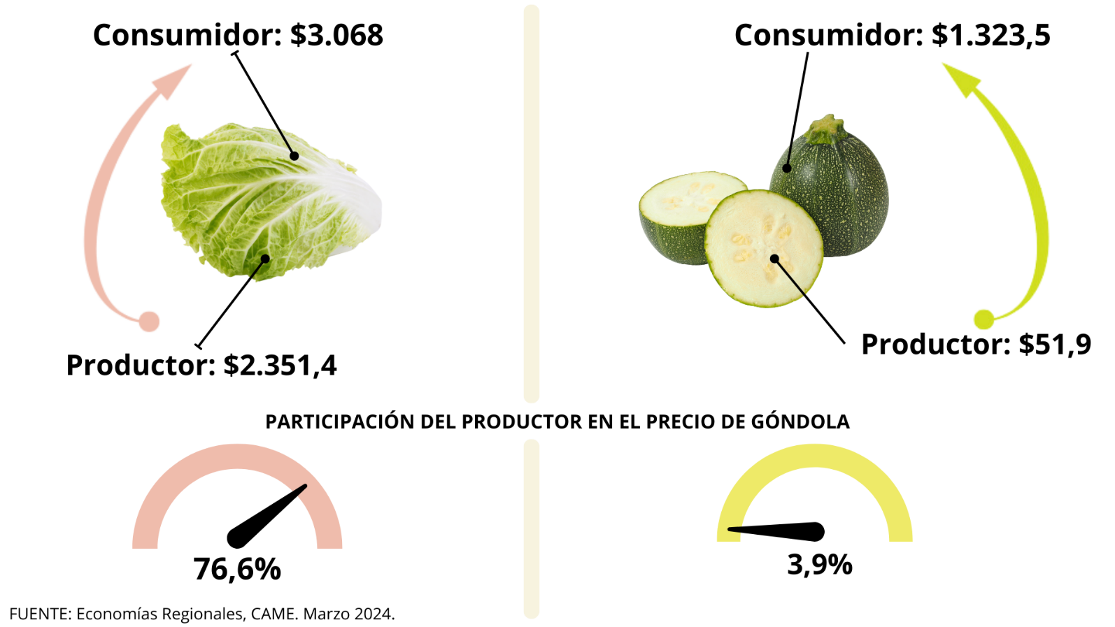 En promedio, la participación del productor explicó el 31,3% de los precios de venta final. La mayor participación la tuvieron los productores de lechuga (76,6%), mientras que la menor fue para los de zapallito (3,9%).