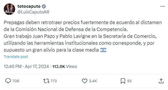 El ministro de Economía, Luis Caputo, utilizó su cuenta de X para celebrar el freno que busca el Gobierno a los aumentos de las prepagas, las cuales deberían retrotraer los mismos a diciembre y basarse en el Índice de Precios al Consumidor (IPC).