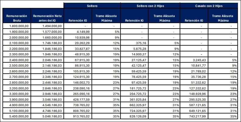 Para el empleado soltero todo sigue igual porque el piso estaba en $ 1.800.000 de sueldo bruto, que era inferior a la base imponible máxima ya vigente para abril. En cambio, para un empleado que dos hijos sin deducción de cónyuge, el piso en abril era de $2.057.405 y en mayo pasaría a $2.092.496.