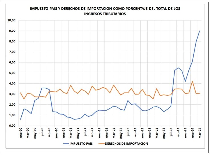 Si se lo compara con los derechos de importación, dado que se aplica todas las compras de divisas, los derechos de importación vienen rondando el 3% del total de los ingresos tributarios, vemos que en marzo el impuesto PAIS representó el 9% del total de los ingresos tributarios. Es decir, el impuesto PAIS es 3 veces más importante en la recaudación que los derechos de importación e incluso supera al impuesto a los créditos y débitos bancarios que llegó a ser el tercer impuesto más importante que en términos de ingresos fiscales.