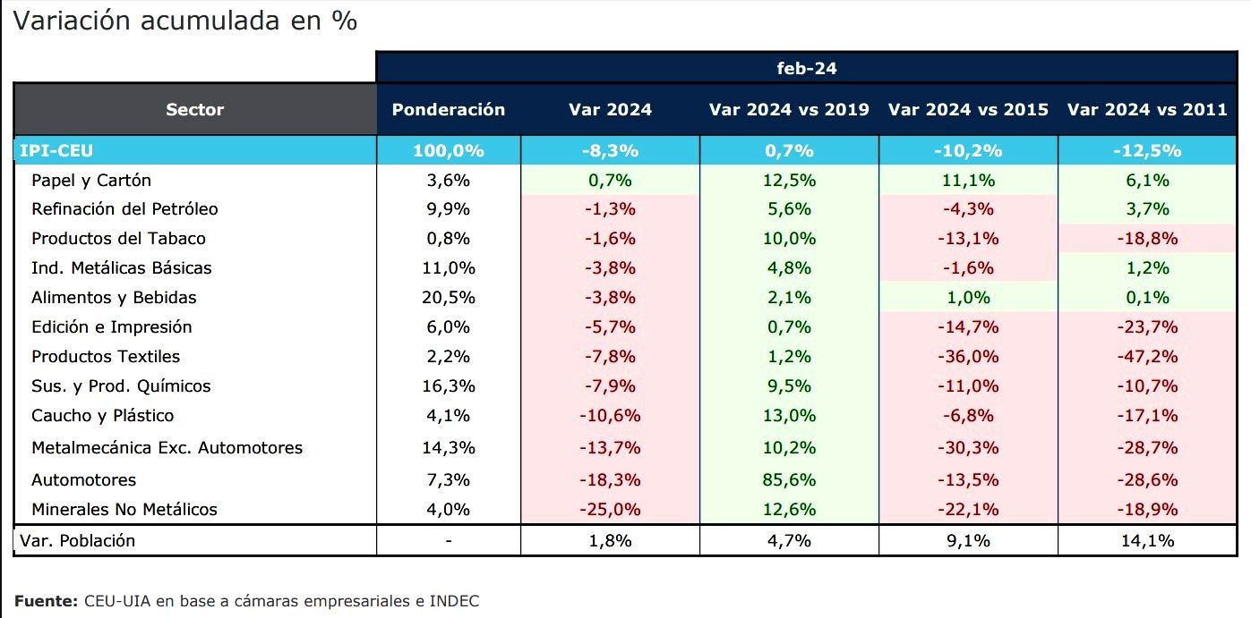 El informe del Centro de Estudios de la UIA, Unión Industrial Argentina, señaló que la actividad industrial cayó 6,8% interanual en febrero, el noveno mes consecutivo con bajas. Además, advirtió que la tendencia continuará en marzo a causa de las dificultades que enfrenta por la suba de costos y la disminución de la demanda.