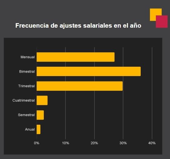 Por eso la consultora advierte que comienza a observar con más frecuencia el incremento de la periodicidad en los ajustes salariales con revisiones bimestrales e, incluso, mensuales para contrarrestar eficazmente el ritmo inflacionario. Al respecto, en el sondeo anterior un 54% de las empresas había dicho que realizaría un ajuste en abril.