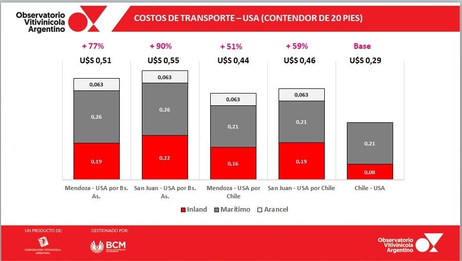 El estudio del Observatorio le puso números a esta situación y explicitó que para el vino argentino es 77% más caro que para el chileno llegar hasta su principal comprador mundial que es Estados Unidos vía puerto de Buenos Aires. Esta diferencia se achica si el producto sale por Chile, pero 51% más alto que lo que deben pagar sus competidores del país vecino. Si se parte desde San Juan la diferencia es de 90% y 59%, respectivamente con incrementos mayores a medida que las bodegas se alejan del centro del país. Además, esta opción no es muy utilizada por la mayoría que son los que venden a granel debido a que existen otras complicaciones relacionadas con los controles del temido Servicio Agrícola y Ganadero de Chile (SAC).
