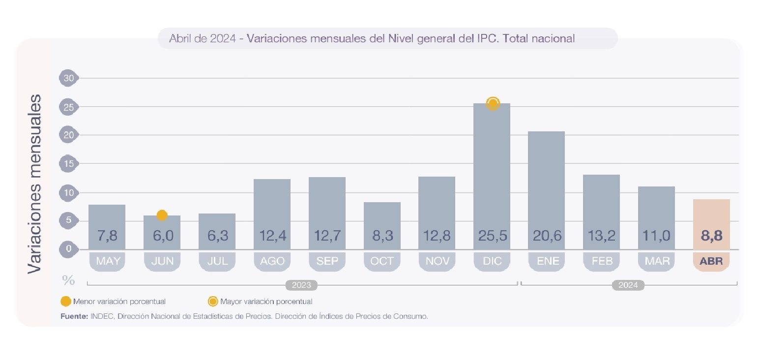 La inflación del mes de abril llegó al 8% y continúa con su ritmo descendente, según el Índice de Precios al Consumidor (IPC) informado por el Indec. De esta manera, el interanual acumulado se ubicó en 289,4%, lo que implica un nuevo récord en 33 años, sólo detrás de los números hiperinflacionarios de 1991.