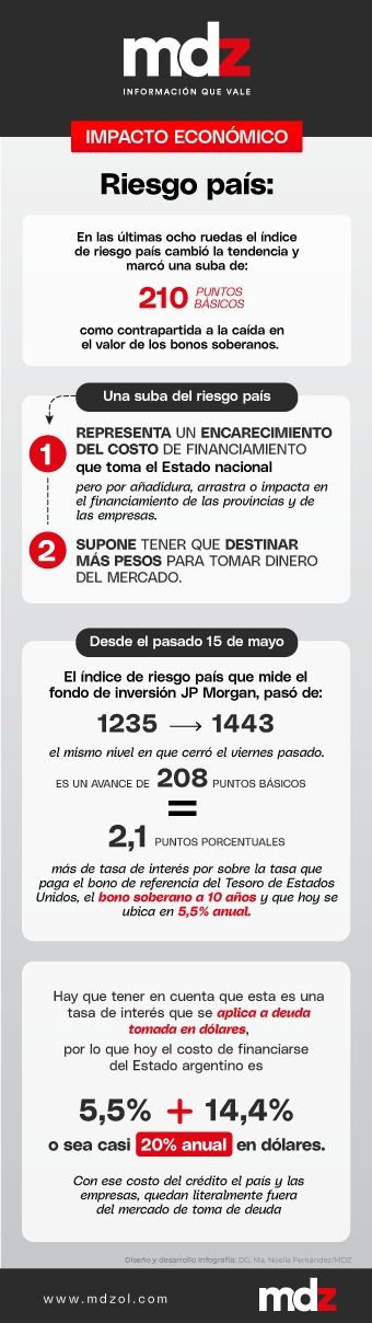 Desde el pasado 15 de mayo el índice de riesgo país que mide el fondo de inversión JP Morgan, pasó de 1235 hasta 1443 este lunes, el mismo nivel en que cerró el viernes pasado. Es un avance de 208 puntos básicos o, lo que es lo mismo, casi 2,1 puntos porcentuales más de tasa de interés por sobre la tasa que paga el bono de referencia del Tesoro de Estados Unidos, el bono soberano a 10 años y que hoy se ubica en 5,5% anual.